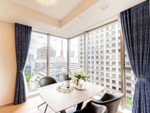 ダイニングテーブルを窓際に寄せることで東京タワーを見ながら贅沢な食事を楽しむことができます。