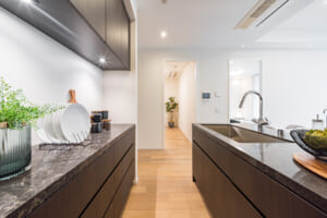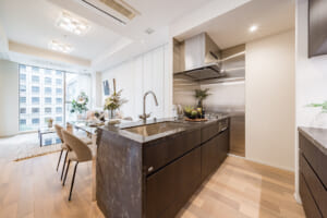 お部屋の中で存在感を放つ高級感あふれるキッチンは食洗器、ディスポーザーを搭載しており、日々の生活の負担を軽減してくれます。