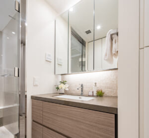 洗面台はほかの部屋と同様に明るく優しい木目調のデザインが採用されており、清潔感のある空間となっています。