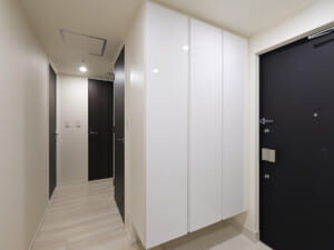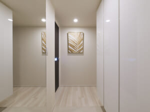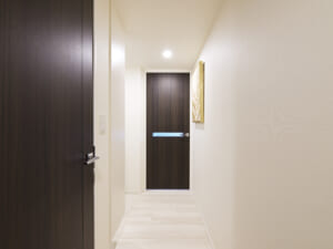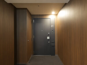 玄関はホテルライクな内廊下仕様となっており、木目長の壁が高級感もありつつ、やわらかい印象を演出してくれています。