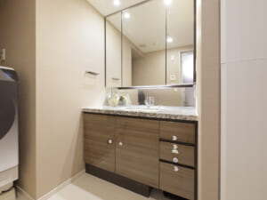 三面鏡の裏は収納スペースとなっており、リネン置き場にちょうどよいスペースとなっています。