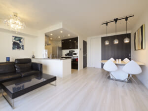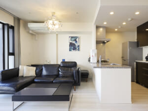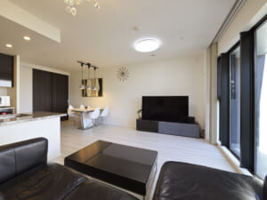 リビングは白と黒を基調としたモダンで洗練されたデザインです。