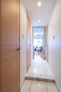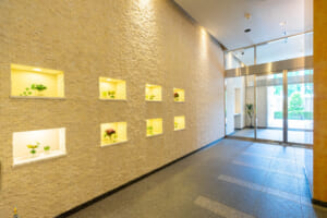 温かみのある照明と壁面のディスプレイが印象的なエントランス。シンプルながらも清潔感のあるつくりで、気持ちよく出入りできる空間。住まいの印象を、より心地よいものにしてくれます。