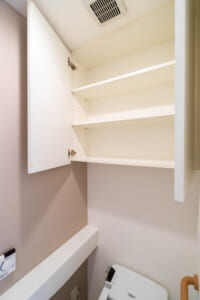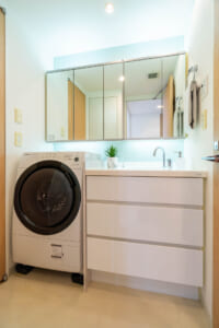 木目の扉と白を基調とした洗面台がやさしい印象の空間。ミラーキャビネットも備え、収納力と機能性を兼ね備えています。朝の支度も快適に進められます。