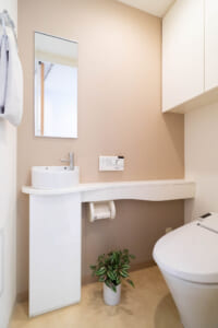 すっきりと整えられた上品なトイレ。やわらかな色温水洗浄便座付きで、毎日快適に使えるトイレ空間。手洗いカウンターや手すりも設置され、使いやすさと衛生面に配慮されています。