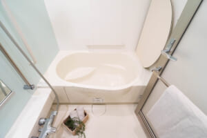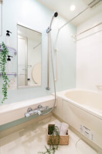 明るいトーンで清潔感もあり、コンパクトながらも使い勝手のよい浴室。手すりやミラー付きで、日々のバスタイムを快適にサポートしてくれます。 湯船にゆったり浸かって、心も体もリフレッシュできます。