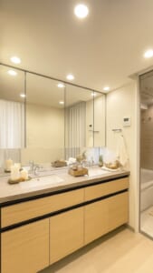 広々としたダブルボウルの洗面台に、大型の三面鏡を組み合わせた開放感のある洗面室。明るく均一なダウンライトの照明が、空間全体を柔らかく照らし、清潔感と高級感を演出します。