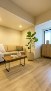 ベージュトーンの床と壁が織りなす柔らかな色調が、空間全体にやすらぎをもたらす洋室。大きな窓から自然光がやわらかく差し込み、日中も明るく快適な居心地を実現します。