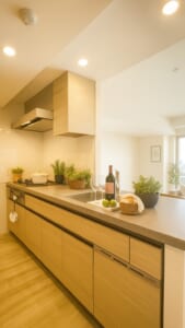 木目調の面材と石目調のワークトップが調和する、ナチュラルで温かみのあるデザイン。食器洗い乾燥機や三口コンロなど設備も充実しており、機能性とデザイン性を兼ね備えた仕様です。