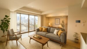 大きな掃き出し窓からはたっぷりと自然光が差し込み、明るく心地よい空間が広がります。窓の外には高層ビル群を望む開放的な景色が広がり、昼夜問わず都会の景観を楽しめます。