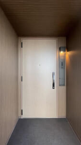 木目調の壁と天井が醸し出す落ち着いた雰囲気に、上品な色合いの玄関ドアが美しく調和。空間全体がまるで高級ホテルのような洗練された印象を与えます。
