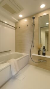 ナチュラルな木目調のアクセントパネルと、柔らかな照明が心地よい空間を演出。白を基調としたバスタブや床が清潔感を引き立て、毎日のバスタイムをより上質なひとときにしてくれます。