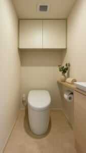無駄のないミニマルな設計により、空間を広く感じさせるトイレルーム。温かみのあるベージュ系の色調が落ち着きを与え、日常の中にやさしい癒しをもたらします。