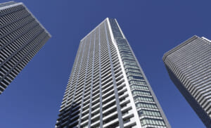 青空に映える洗練されたツインタワー「ドゥ・トゥール EAST」。ガラスのファサードと直線的なフォルムが、都市のランドマークとしての風格を漂わせます。都心の利便性と水辺の開放感を併せ持つ、唯一無二の住環境です。