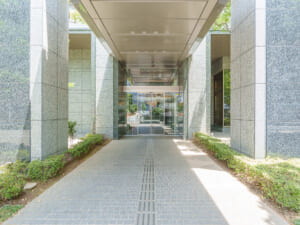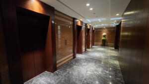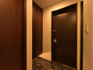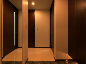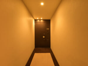 石目調の床と落ち着いた色合いの内装が、上品で静かな印象を与える共用部です。やわらかな照明が空間全体に広がり、洗練された雰囲気を醸し出しています。