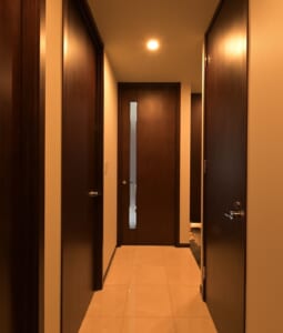 自然な光沢と重厚感が美しい大理石のフロアが、住まう人の毎日を上質に彩る廊下空間。一歩足を踏み入れると、磨き上げられた大理石の質感が静かな気品を漂わせ、日常の何気ない瞬間にも優雅さを添えてくれます。来客を迎える動線としても申し分なく、端正で洗練された雰囲気が住まい全体の印象を一段と引き立てます。落ち着いた色味の建具とのコントラストも美しく、静けさの中に確かな存在感と品格を放つ一角です。