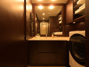 空間全体に上質な雰囲気を醸し出す洗面室。大判の鏡や木調パネルとのコントラストが美しく、大理石の床とカウンターが穏やかな光を受けて上品な艶めきを放ちます。まるで高級ホテルを思わせる落ち着きと気品が漂う空間です。