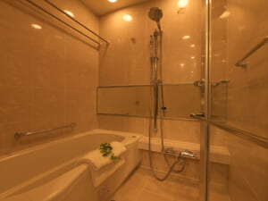 浴室は浴槽と洗い場がゆったりと確保された設計で、日々の疲れをしっかりと癒せる空間です。手すりやカウンターが設けられており、使い勝手にも配慮されています。浴室乾燥機にも対応しており、天候に左右されず洗濯物を乾かせるのも便利なポイントです。