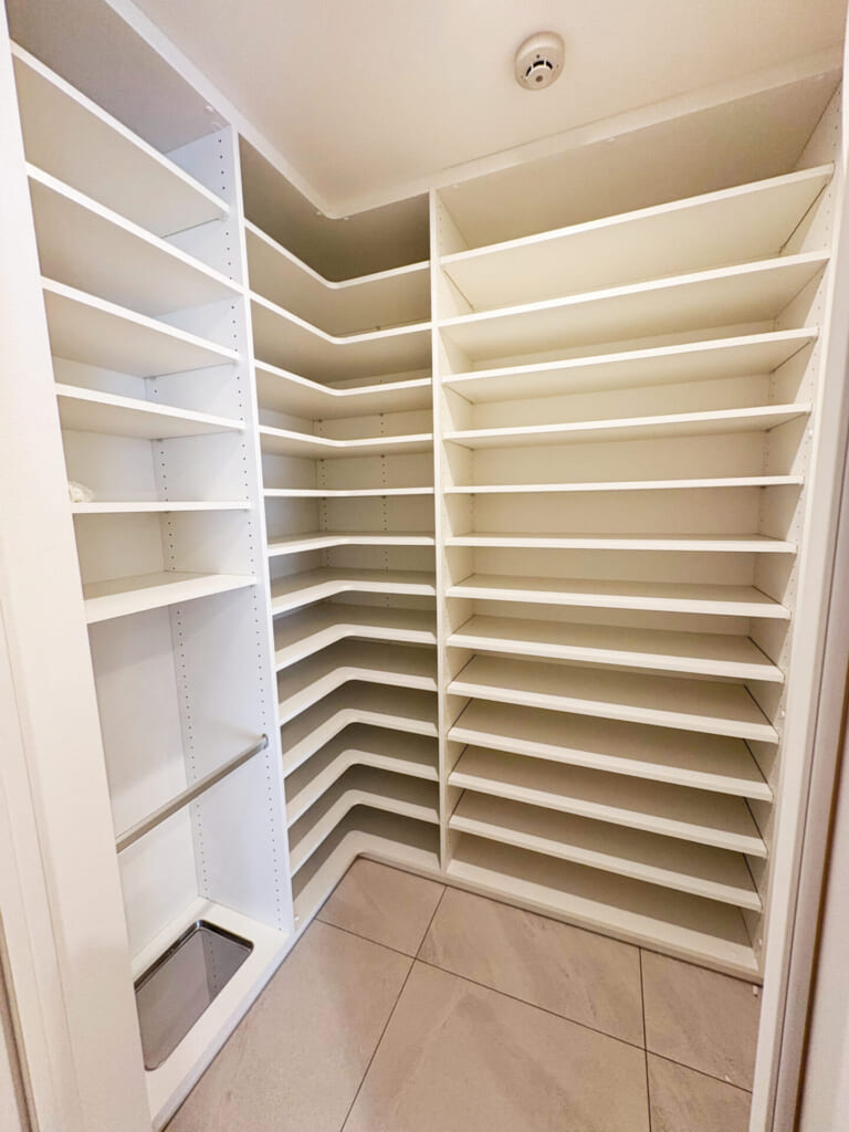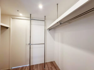 ゆとりある広さと複数のハンガーパイプを備え、衣類やバッグ、小物を効率的に収納できます。天井までの高さを活かした設計で、季節ごとの衣替えもスムーズ。