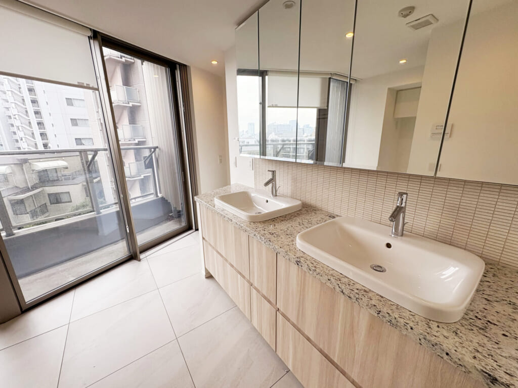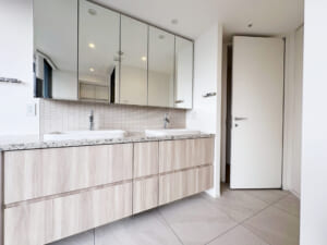 大きな鏡面収納とダブルボウルを備えた、ホテルライクな洗面室。2人同時の使用にもゆとりがあり、忙しい朝もスムーズに支度ができます。