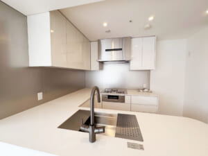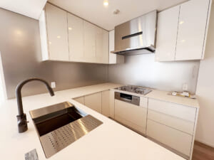 収納も上下にたっぷりと確保されており、生活感を感じさせないすっきりとした空間です。