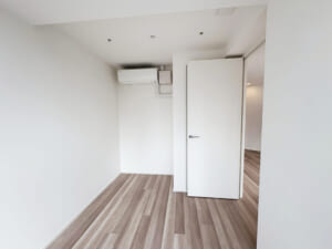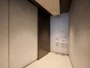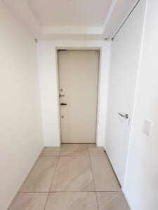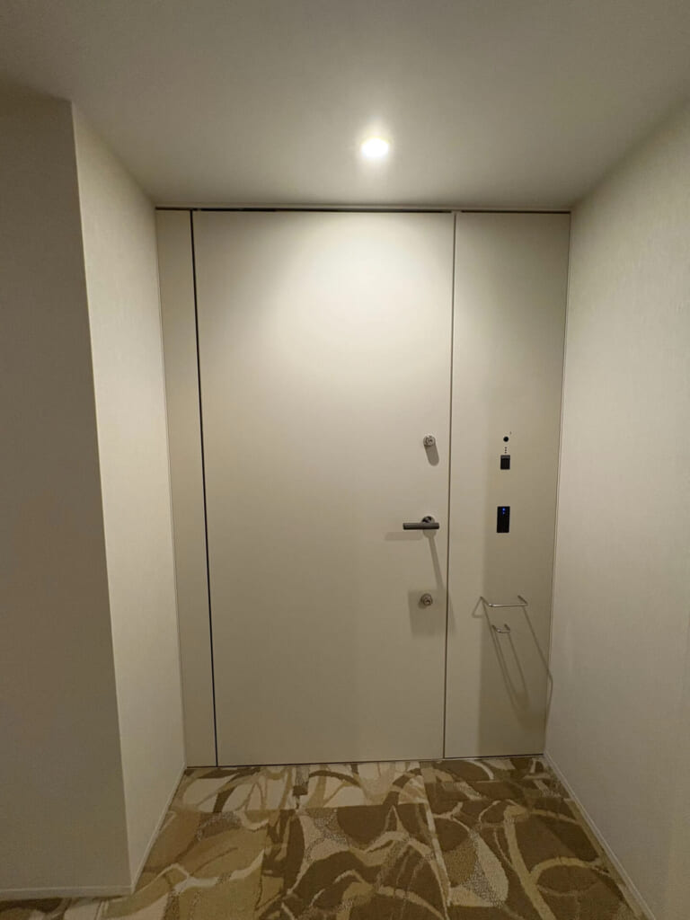 シンプルかつ上品なデザインの玄関ドアが印象的なエントランス。柔らかな照明が落ち着いた雰囲気を演出し、ホテルライクな高級感を漂わせます。