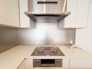 光沢のある扉材とステンレスのレンジフードがスタイリッシュな印象を与え、空間全体を上品にまとめています。