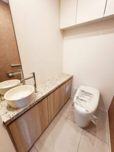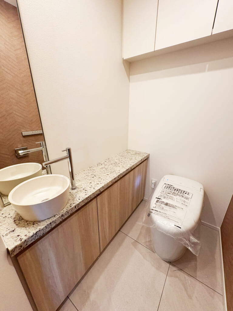 天然石調のカウンターとボウル型の洗面が印象的な、デザイン性の高いトイレ空間。