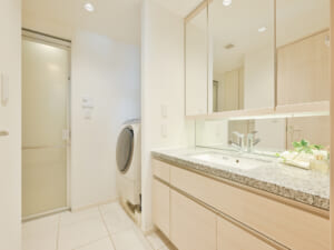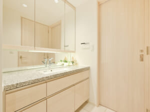 明るい照明に照らされた洗面スペースは、清潔感が際立つ端正な印象です。