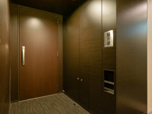 深みのある木目調パネルでまとめられた玄関は、ホテルライクな落ち着きを感じさせる空間です。