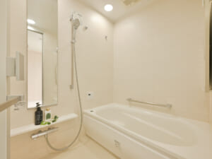 ゆとりを持たせた浴槽は身体をゆったりと預けられる設計で、日々の疲れを静かに癒す時間を演出。