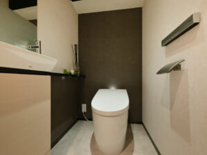 壁面と床の素材感が統一され、空間全体に清潔で上品なまとまりを感じさせます。