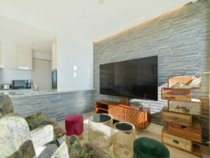 アクセントウォールには石調素材を採用し、空間に程よい重厚感と上質な雰囲気をプラス。