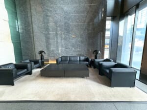 大開口のガラス面から自然光が注ぎ、石材や意匠壁が上質な雰囲気を際立たせています。