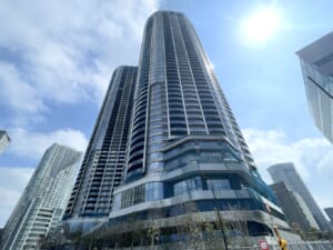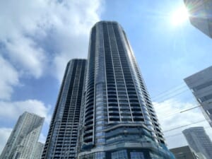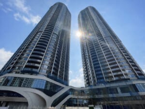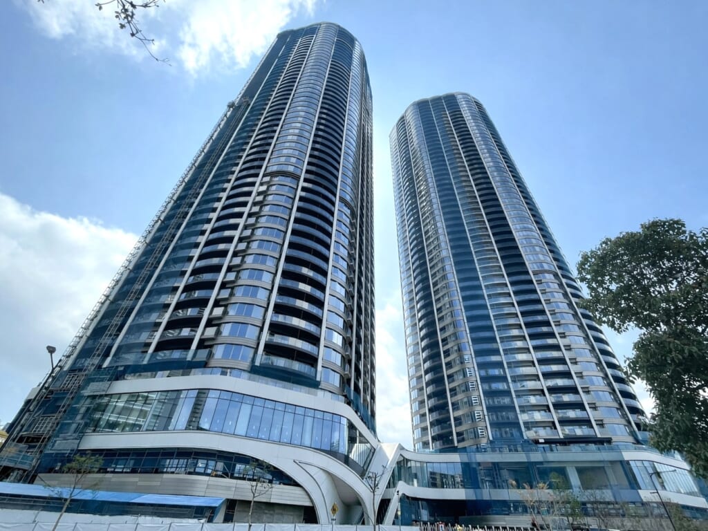 建物は湾岸の景観に映える流麗なフォルムとガラスを基調とした洗練された外観デザインが特徴で、ツインタワーならではのスケール感と存在感を放ちます。
