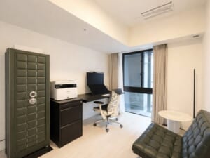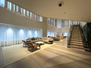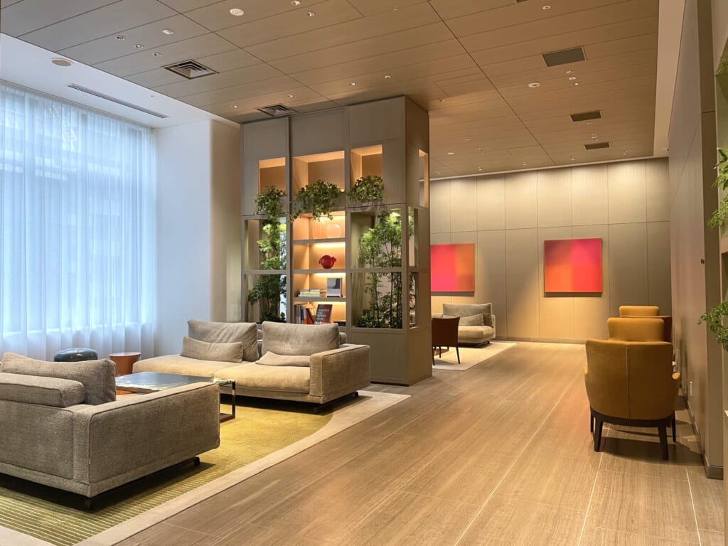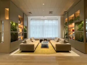 落ち着いた色調とやわらかな照明計画が印象的な、上質感あふれる共用ラウンジ。ゆったりと配置されたソファや緑のあしらいが、都心の暮らしに寛ぎのひとときをもたらします。