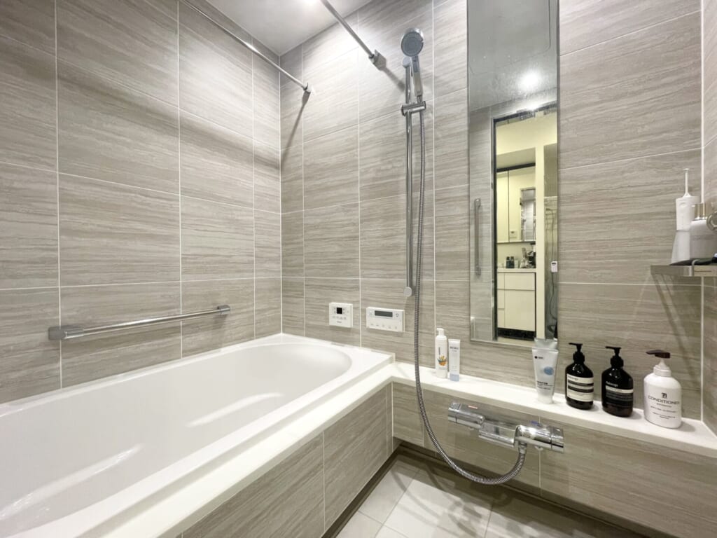 浴槽の縁からミラー横までつながるカウンターにゆとりがあり、ボトル類を置いても雑然としにくい設計です。